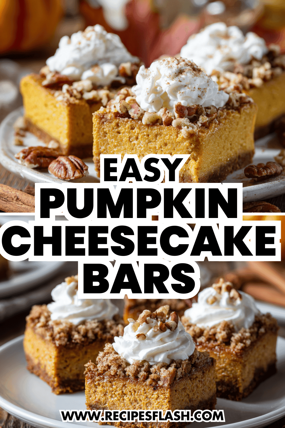 Love these pumpkin cheesecake bars? Save this recipe on Pinterest under your Thanksgiving Desserts board or bookmark it for your next fall celebration.